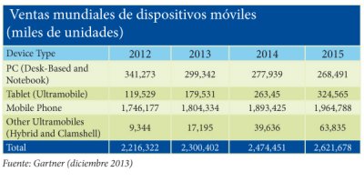 Las ventas combinadas globales de dispositivos (PCs, tablets, ultramóviles y teléfonos móviles) alcanzarán los dos millones y medio de unidades en este 2014, lo que significa un aumento del 7’6% respecto al año anterior, según apunta la consultora Gartner. En cuanto a sistemas operativos, Android va camino de superar los mil millones de usuarios teniendo en cuenta todos los dispositivos en los que está presente. Sus impulsores principales son los mercados emergentes. De hecho, se espera más del 75% de las ventas de este sistema operativo provengan de estas regiones en 2017.